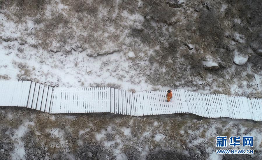 2月28日,在驼梁国家级自然保护区,巡护员戎喜民在进行巡护工作(无人机照片)。 新华社记者 金皓原 摄
