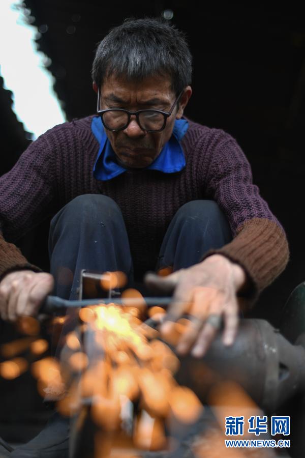 2月28日,贵州省黔东南苗族侗族自治州凯里市湾水镇,一名铁匠在赶制农具。