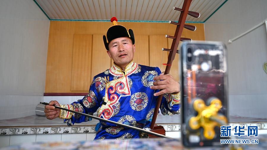 内蒙古自治区通辽市开鲁县脱贫户包莲在直播弹奏四弦胡琴(2月22日摄)。新华社记者 贺书琛 摄