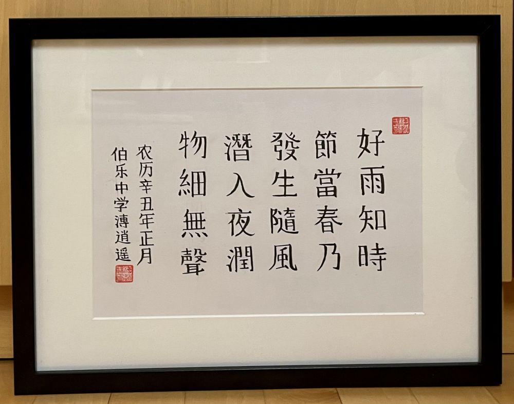 图为德国伯乐高级文理中学高三学生安德烈·波尔特诺夫(中文名溥逍遥)的书法作品。中国驻德国大使馆供图