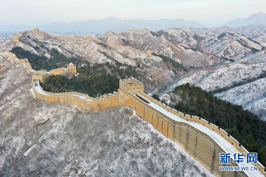 这是3月1日在河北承德境内拍摄的金山岭长城雪景(无人机照片)。新华社发(周万平 摄)