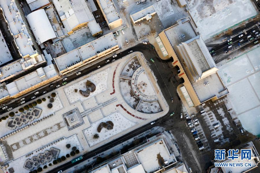 3月1日拍摄的雪后甘肃省武威市南城门广场(无人机照片)。新华社发(姜爱平 摄)