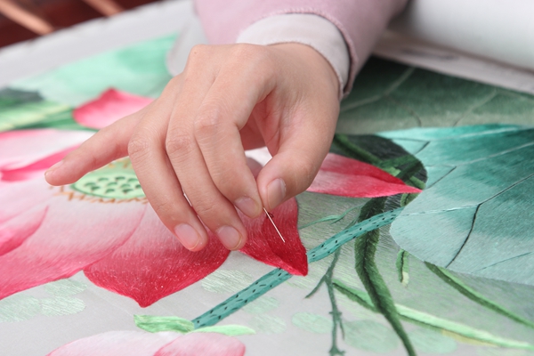 一根细针,几缕丝线,在郑东新区CBD天下收藏文化街,河南省乡村出彩巧媳妇张留凤身着旗袍用细如发丝的绣线和她那纤纤素手,绘制着祖国的“大好河山”。