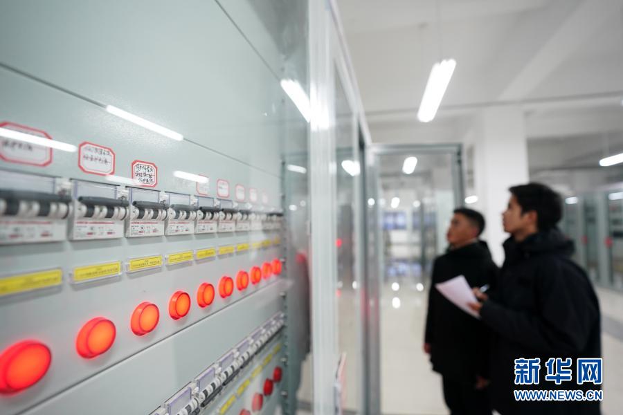 在西藏阿里与藏中电网联网工程萨嘎220千伏变电站,工作人员查看设备运行情况(2020年11月27日摄)。新华社记者 詹彦 摄