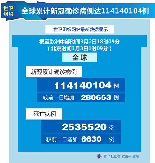 新华社日内瓦3月2日电(记者刘曲)世界卫生组织2日公布的最新数据显示,全球累计新冠确诊病例达114140104例。