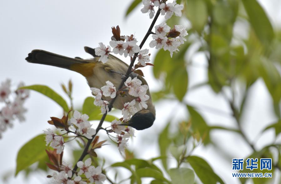3月2日,在湖北省恩施土家族苗族自治州宣恩县贡水河国家湿地公园,一只黄臀鹎在花枝上停留。新华社发(宋文 摄)