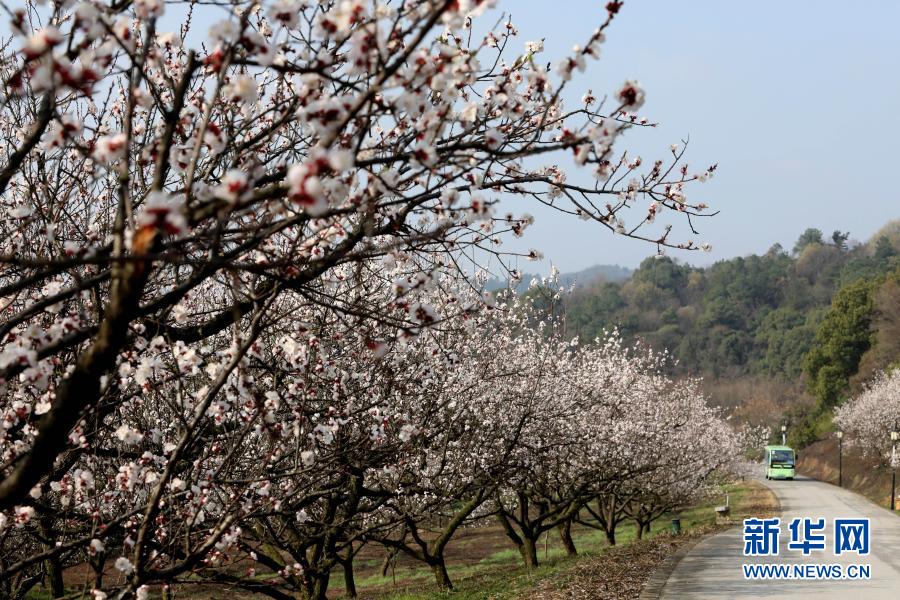 3月2日,一辆观光车在苏州上方山国家森林公园内开满鲜花的小道上前行 。新华社发(杭兴微 摄)
