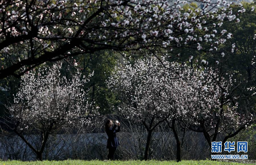 3月2日,游客在苏州上方山国家森林公园内观赏杏花。新华社发(杭兴微 摄)