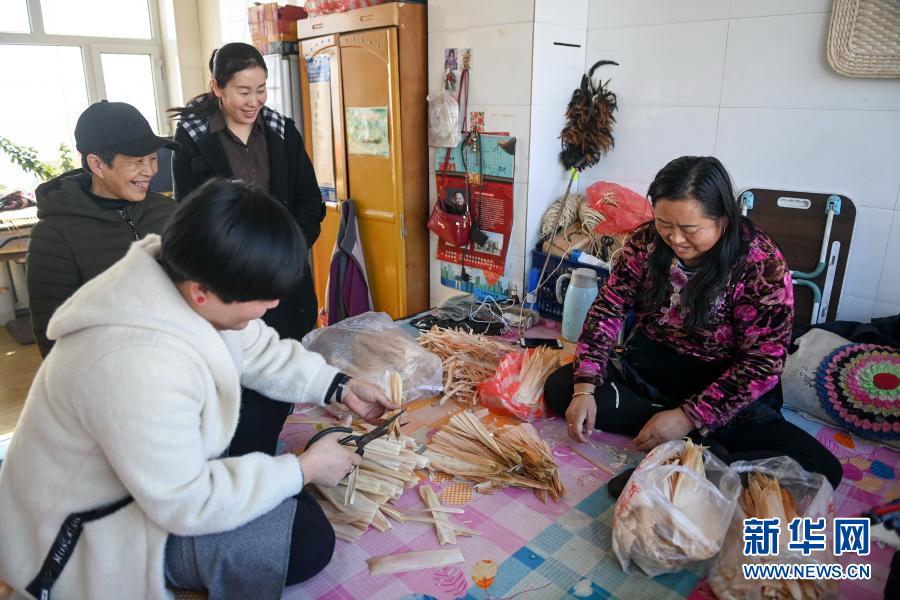 3月2日,周艳文(前左)到榆树市巾帼草编合作社联合社的社员家中讲解草编制作。新华社记者 颜麟蕴 摄