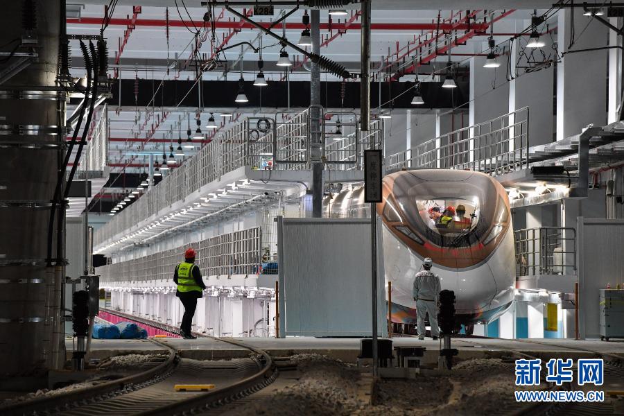 3月3日,广州地铁18号线时速160公里电客车停靠在陇枕停车场,静待热滑试验。