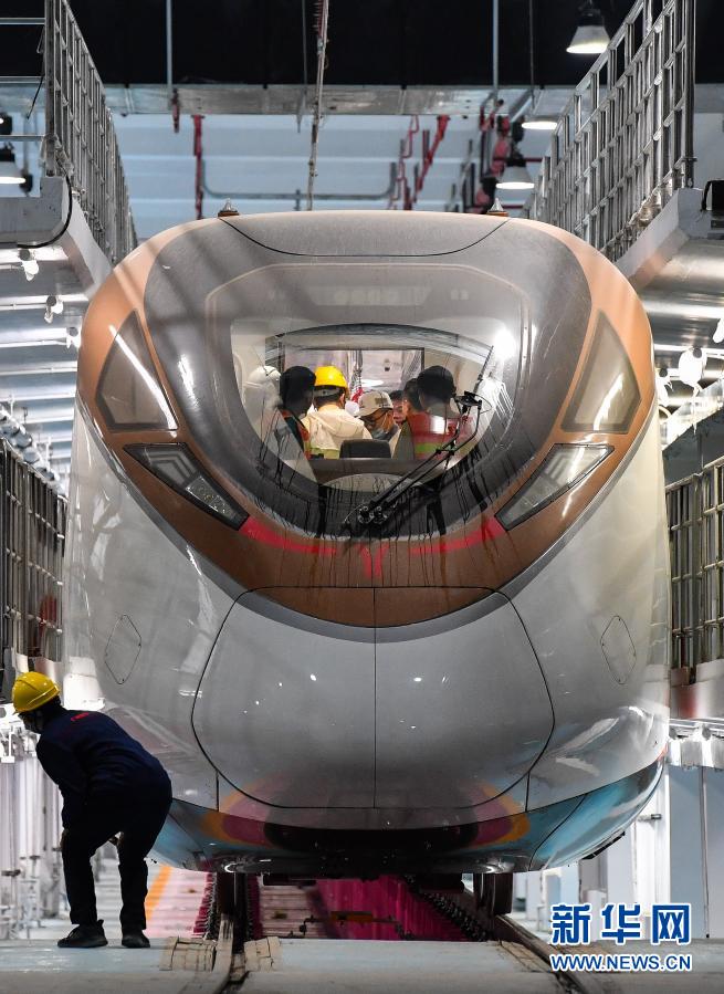 3月3日,参加热滑试验的技术人员对广州地铁18号线时速160公里电客车进行发车前最后一次设备状况查验。