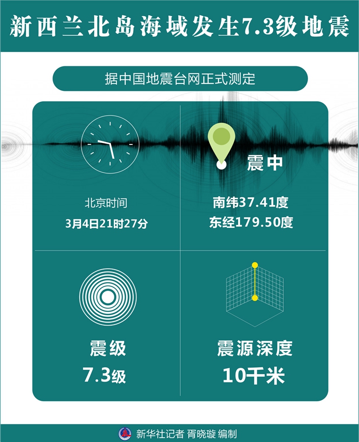 新华社北京3月4日电 据中国地震台网正式测定:北京时间3月4日21时27分(当地时间3月5日1时27分)在新西兰北岛海域(南纬37.41度,东经179.50度)发生7.3级地震,震源深度10千米。