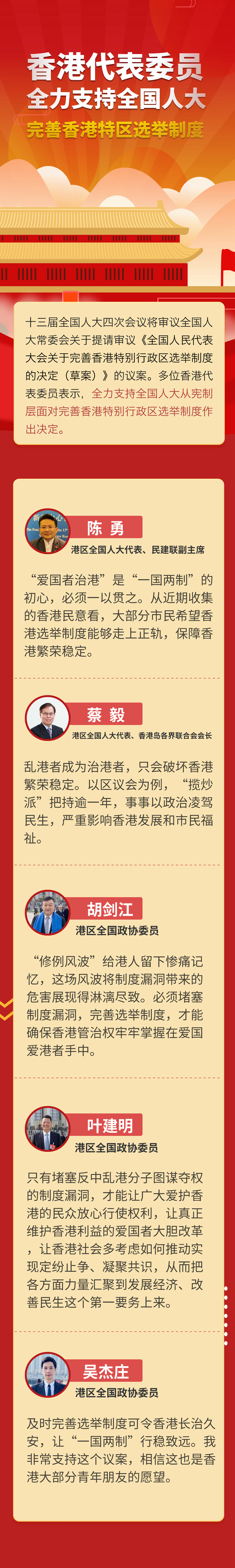 港区全国人大代表、民建联副主席陈勇表示,“爱国者治港”是“一国两制”的初心,必须一以贯之。“将完善香港特别行政区选举制度列入大会议程,我们全力支持。”他说,从近期收集的香港民意看,大部分市民希望香港选举制度能够走上正轨,保障香港繁荣稳定。