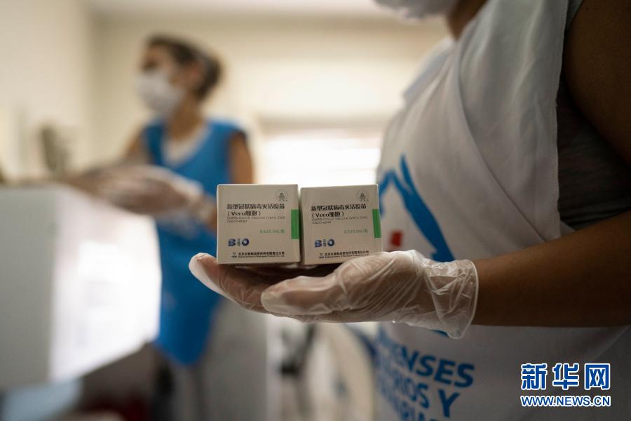 3月3日,在阿根廷布宜诺斯艾利斯省拉普拉塔市,一名医务人员准备将中国新冠疫苗放入简易的冰柜中储藏。新华社发(马丁·萨巴拉摄)