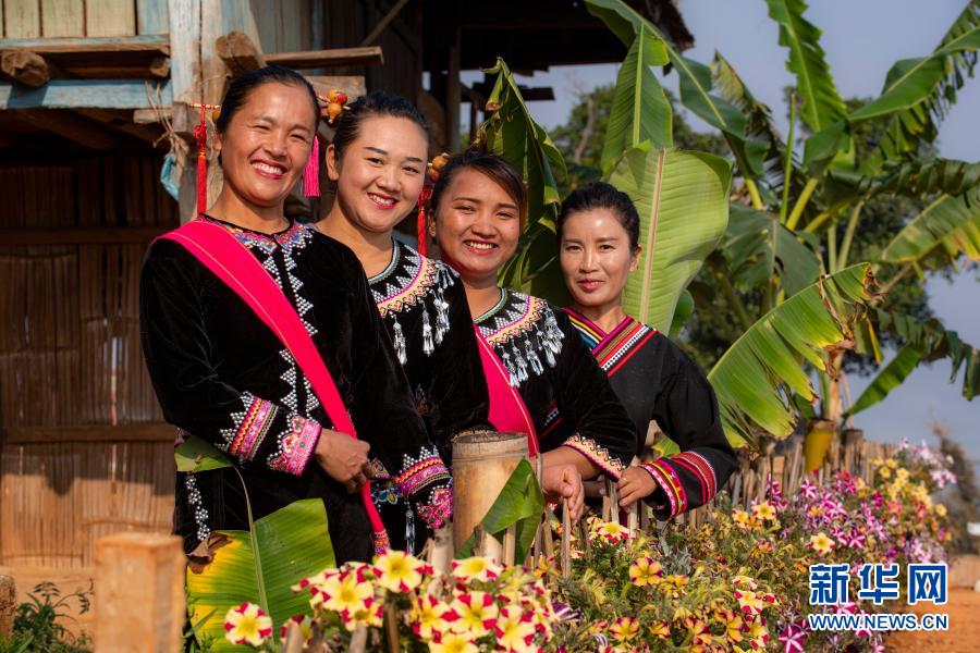 罗娜算(右二)、郭玉兰(左二)与“摆舞队”队员们在村里合影(3月4日摄)。新华社记者 江文耀 摄
