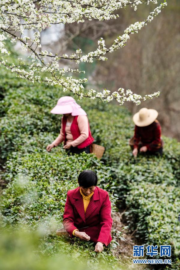 3月4日,安康市汉滨区流水镇群众在采摘新茶。新华社记者 陶明 摄