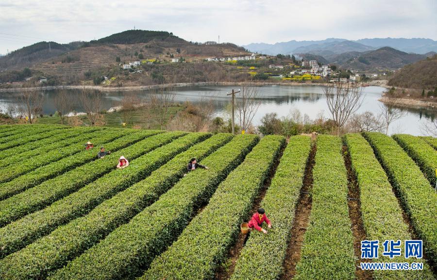 3月4日,茶农在安康市汉滨区流水镇刚子茶叶专业合作社标准化茶园采摘新茶(无人机照片)。新华社记者 陶明 摄
