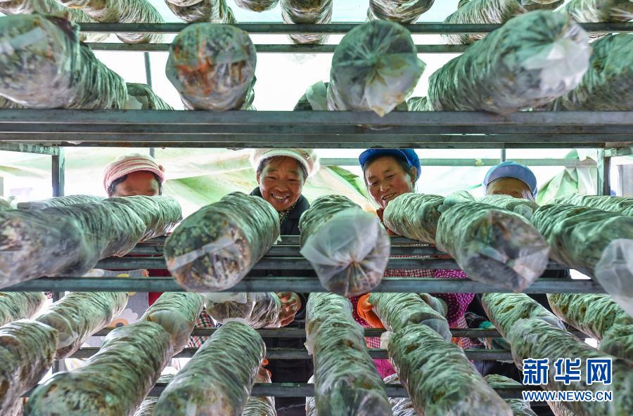 从巧家县大山里搬迁到鲁甸易地扶贫搬迁安置区的范启美(左二)和姚永莲(右二)在卯家湾食用菌种植基地干活,她们在这个香菇车间每天能挣80多元钱(3月4日摄)。新华社记者 刘大伟 摄
