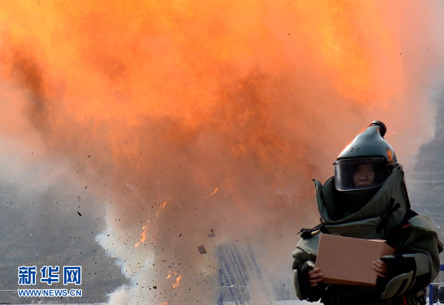 3月5日,一名女特警队员身着80斤重的排爆服,手持爆炸装置走过爆炸障碍区。