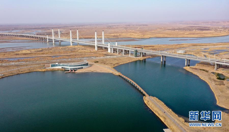 黄河流经宁夏银川市滨河黄河大桥(3月2日摄,无人机照片)。新华社记者 冯开华 摄