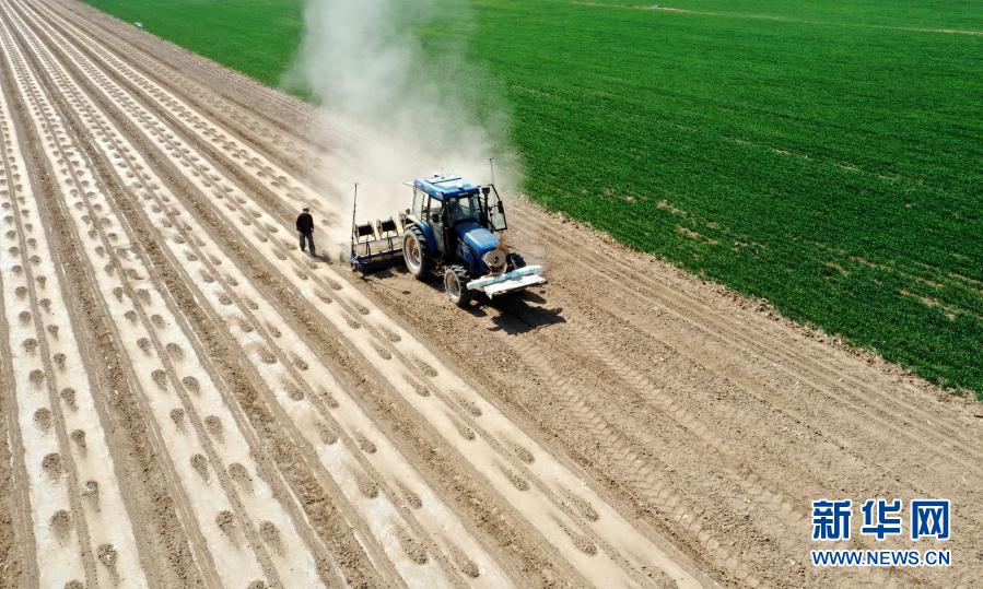 在新疆生产建设兵团第六师共青团农场,一台安装北斗导航自动驾驶系统的播种机在播种棉花(2020年4月8日摄,无人机照片) 。新华社发(李华北 摄)