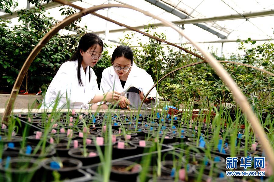 上海植物园科研人员程琳(左)、张蕾蕾在温室观察记录花菖蒲新品种生长情况(2020年6月5日摄)。新华社记者 张建松 摄