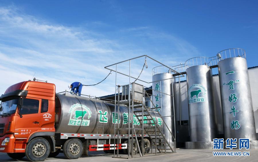 在黑龙江飞鹤乳业股份有限公司专属的甘南县瑞信达原生态牧场,工作人员在检查一辆刚装完鲜奶的全封闭低温安全运输车(2018年10月30日摄)。新华社记者王建威摄