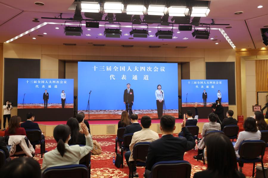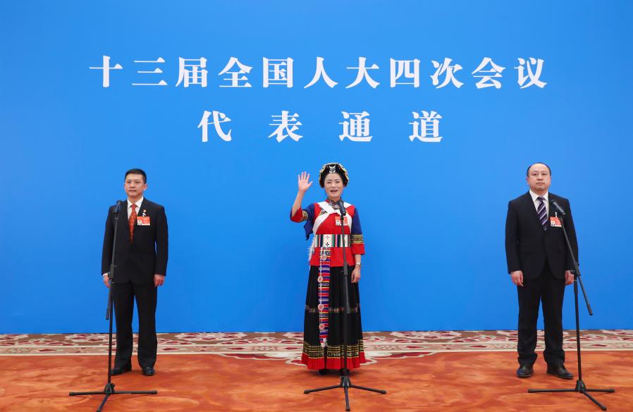 3月5日,第十三届全国人民代表大会第四次会议举行首场“代表通道”采访活动。这是记者在分会场通过网络视频方式采访。新华社记者 曹灿 摄
