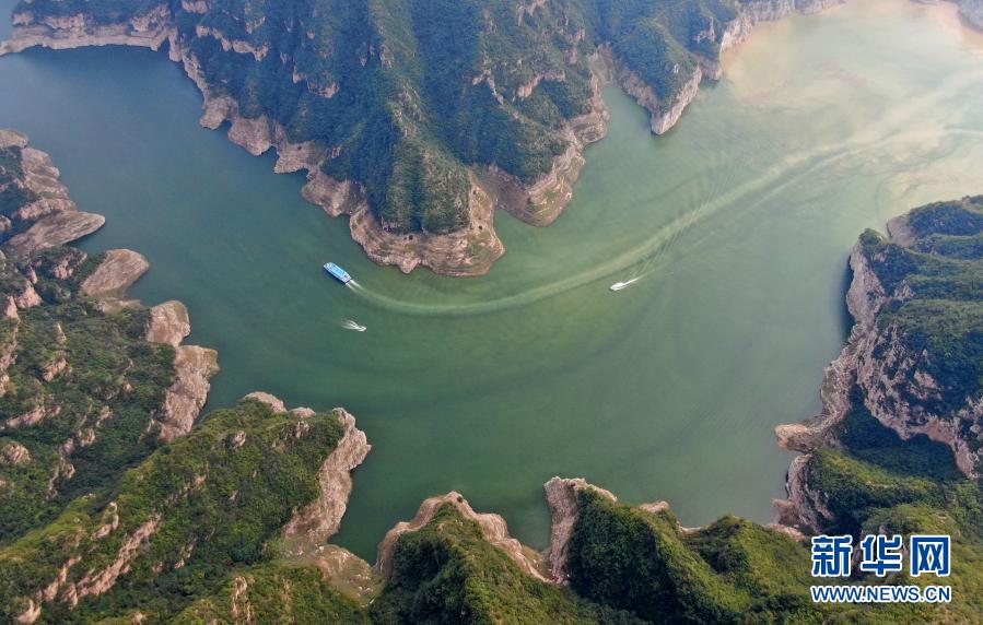 这是在河南济源拍摄的“黄河三峡”景色(2020年9月12日摄,无人机照片)。在黄河河南段,沿黄各地生态廊道建设如火如荼,黄河母亲梳洗旧颜,披上“绿裳”。新华社记者 郝源 摄