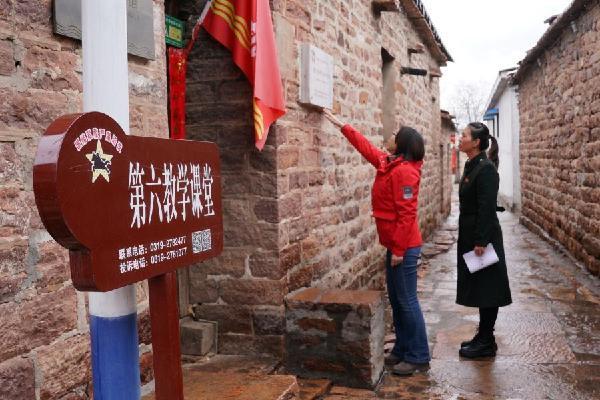 3月6日,在河北邢台信都区浆水镇安庄村抗大卫生处旧址,杨树和讲解员李青一起查看旧址保护牌匾。新华社记者 范世辉 摄
