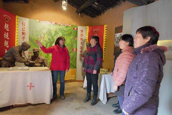 3月6日,在河北邢台信都区浆水镇抗大卫生处旧址安庄村里的陈列馆,杨树向村里的妇女介绍抗大卫生处,鼓励他们做志愿讲解员。新华社记者 任丽颖 摄