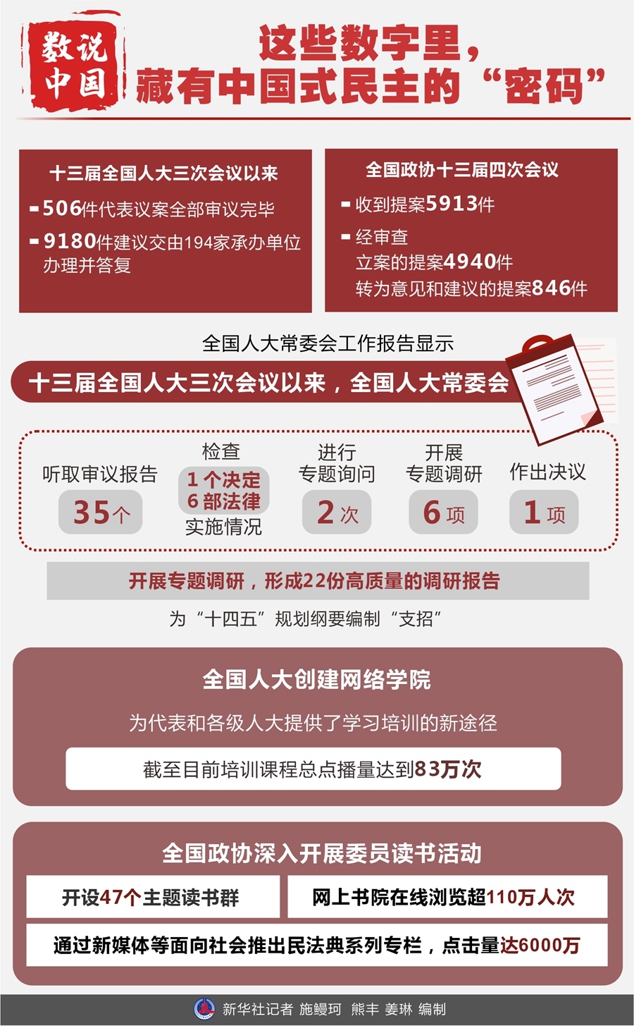 数字,蕴藏中国式民主的“密码”。透过全国人大常委会工作报告、全国政协常委会工作报告和提案工作情况报告,让我们从几组关键数据进行“解码”。