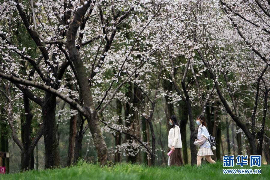 花海绚烂,笑靥如花。武汉东湖磨山樱园内,粉色的樱花在连日春雨的浸润下次第绽放、娇俏可人。园内鸟鸣啾啾,游客三五成群。首批慕名而来的医护人员、本地市民和全国各地的游客纷纷在樱花树下驻足欣赏、嬉笑拍照。
