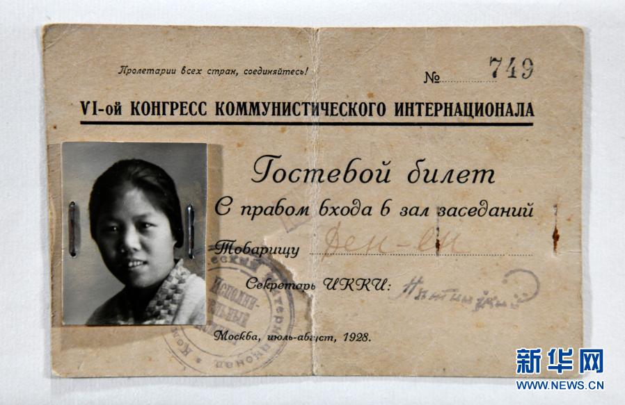 “这是一个长方形的纸质证件,俄文印刷的,上面印有‘全世界无产者联合起来’‘共产国际第六次代表大会’,用订书钉固定了一张邓颖超同志的黑白照片,加盖有共产国际执委会的徽章。”李勤介绍说,这是1928年邓颖超参加共产国际六大的列席证。此行,邓颖超还有一个更重要的任务,陪同周恩来参加党的第六次全国代表大会。