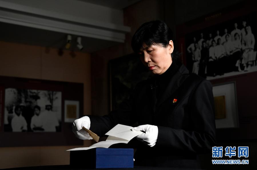 周恩来邓颖超纪念馆陈列保管部副主任李勤从一个蓝色小箱子中拿出列席证(2020年12月23日摄)。新华社记者 李然 摄