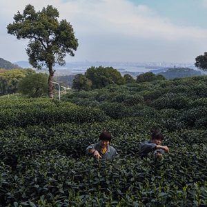 3月12日,在位于杭州市西湖风景名胜区满觉陇村白鹤峰的西湖龙井茶叶基地,茶农在采摘西湖龙井头茶,远处就是杭州西湖。