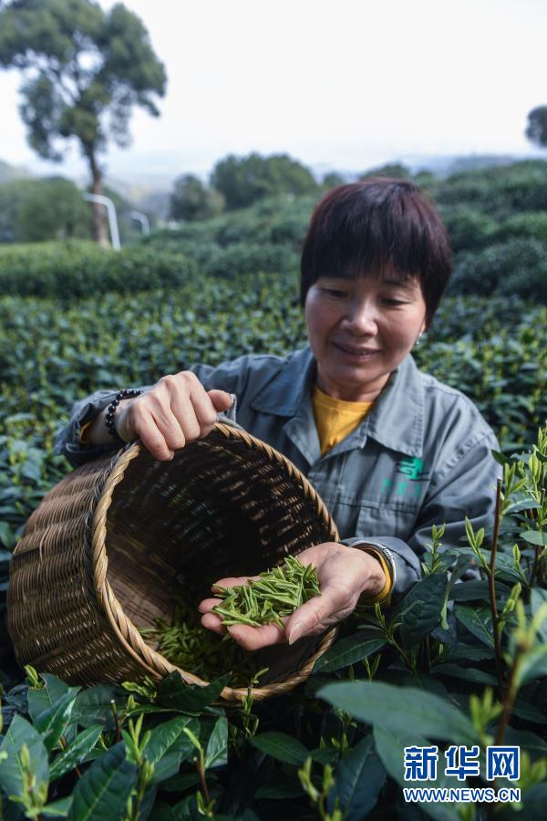 3月12日,在位于杭州市西湖风景名胜区满觉陇村白鹤峰的西湖龙井茶叶基地,茶农展示刚刚采摘的西湖龙井茶鲜叶。