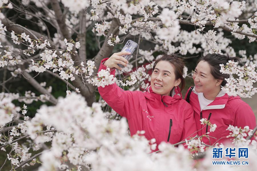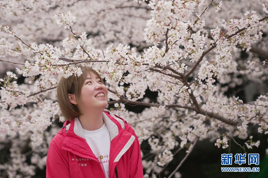 3月13日,武汉雷神山医院医护人员在樱花树下赏花。新华社记者 熊琦 摄