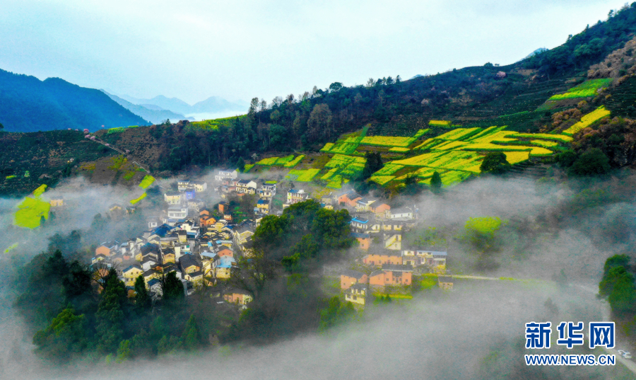 3月13日,在大坑源村,金灿灿的油菜花在云雾的映衬下,美不胜收。新华网发(左学长 摄)