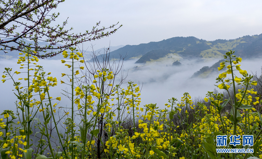 3月13日,在大坑源村附近,金灿灿的油菜花与云雾相互映衬,美不胜收。新华网发(左学长 摄)