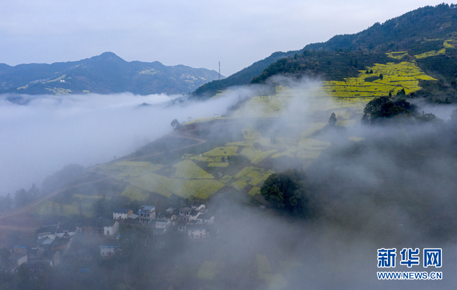 3月13日,大坑源村雾色朦胧,美不胜收。新华网发(左学长 摄)