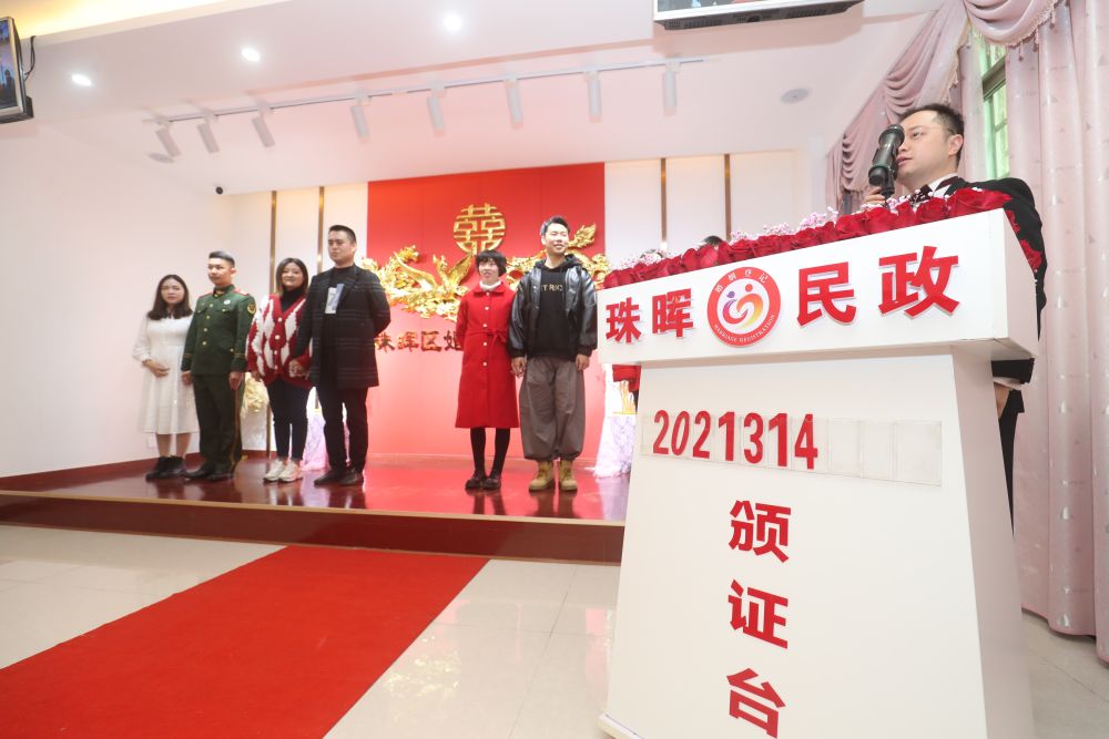 3月14日,湖南衡阳市珠晖区婚姻登记中心,新人们参加集体领证仪式。新华社发(罗盟摄)