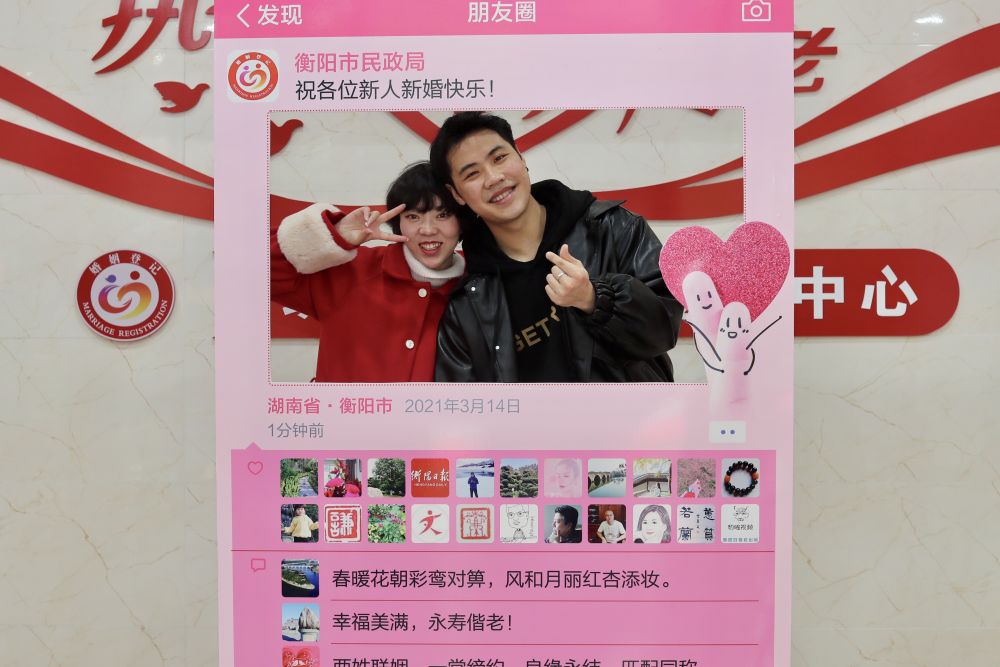 3月14日,湖南衡阳市珠晖区婚姻登记中心,一对新人领证后留影。新华社发(罗盟摄)