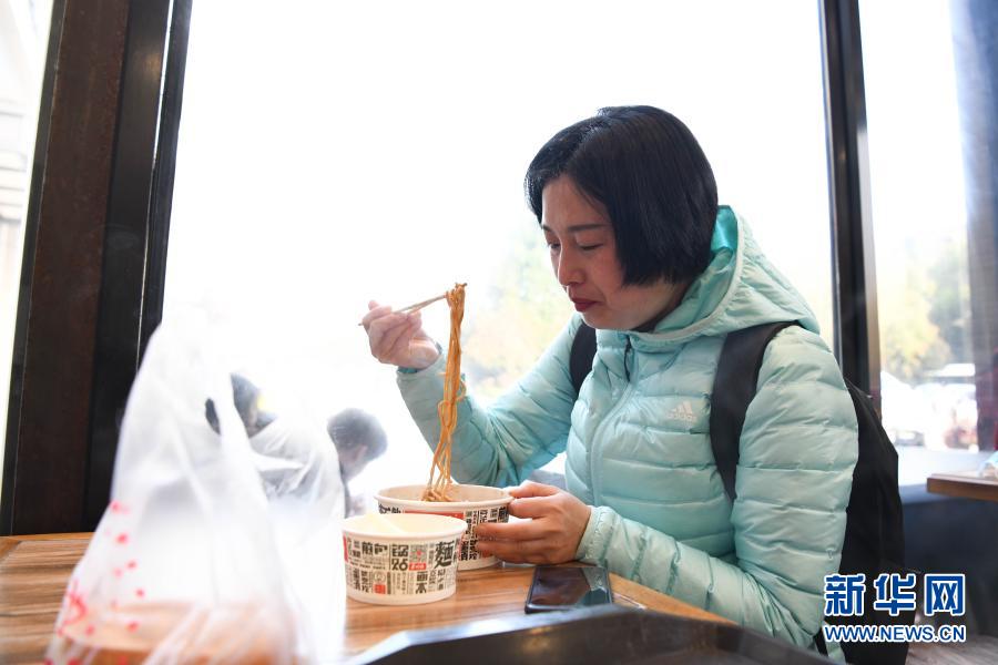 3月14日,周国红在武汉一家早餐店里吃热干面。新华社记者 张端 摄