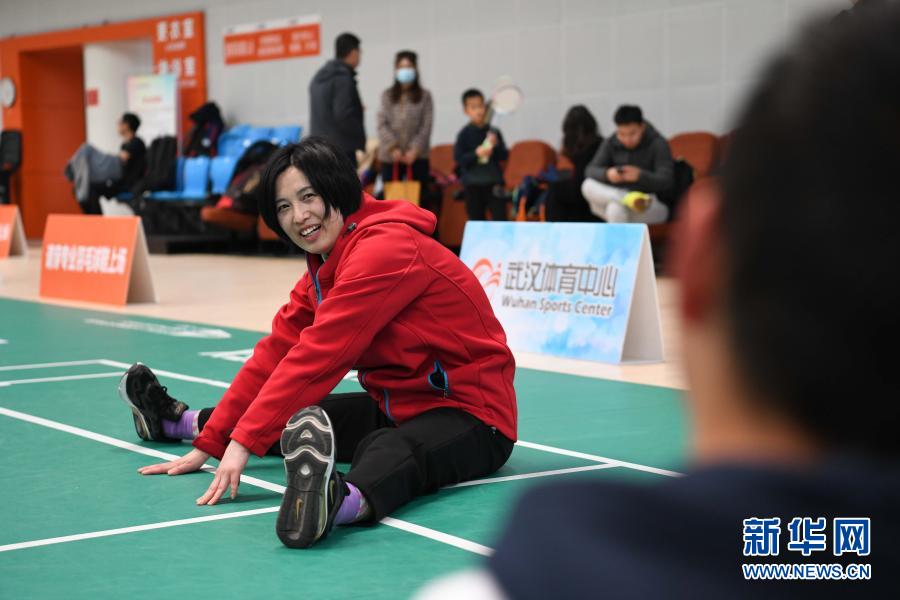 3月13日,在武汉体育中心内,周国红与一名正在进行体育锻炼的孩子交流。这里曾作为方舱医院使用。 新华社记者 张端 摄