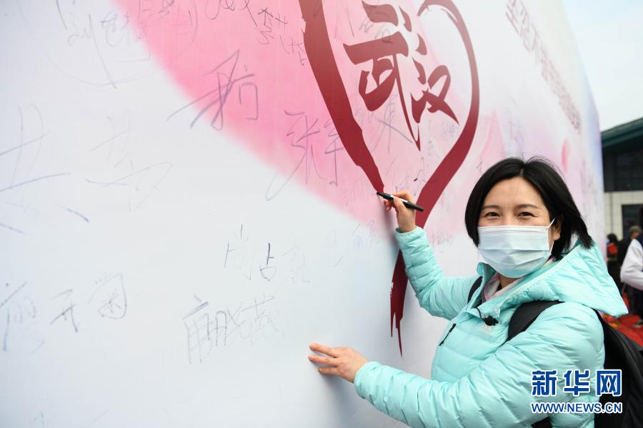 3月13日,周国红在武汉大学援鄂抗疫医护人员赏樱专场活动中签名留念。新华社记者 张端 摄