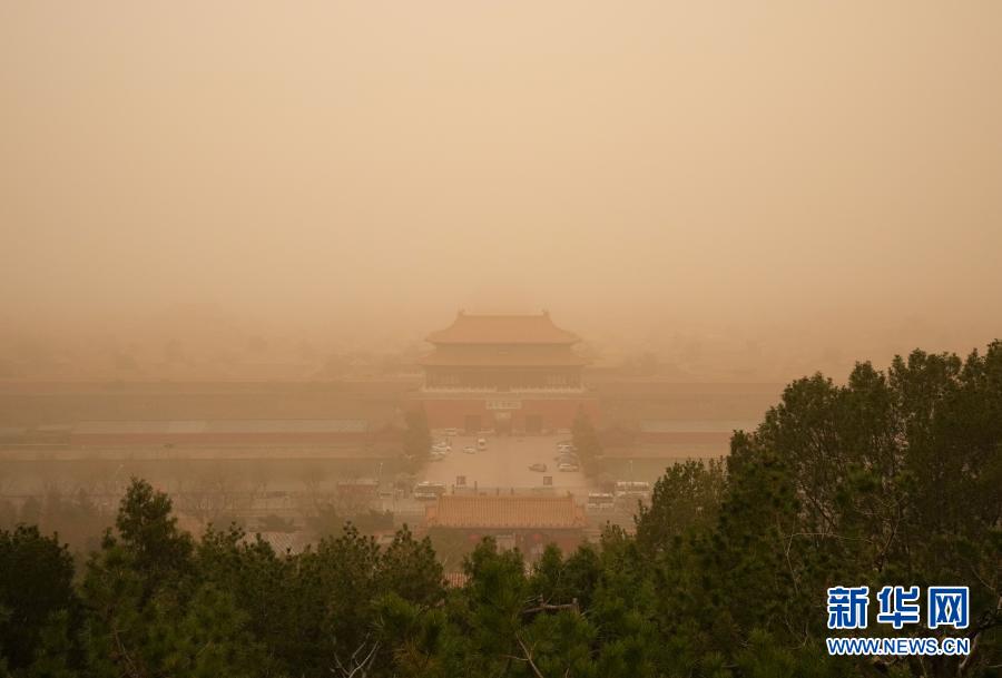 这是3月15日在景山上拍摄的北京故宫。当日,我国北方多地出现沙尘天气。新华社记者 陈晔华 摄