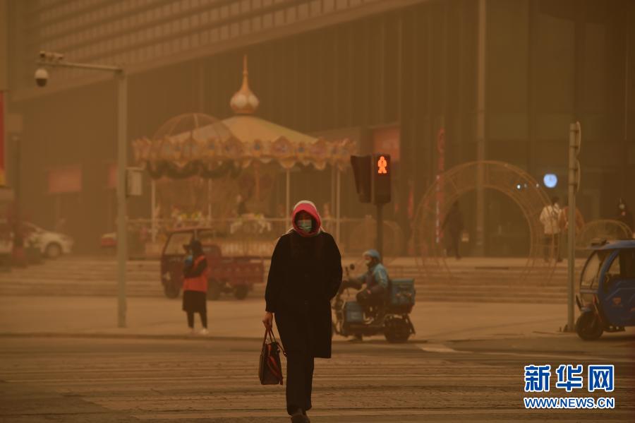 3月15日,宁夏银川市民在沙尘中通过十字路口。当日,我国北方多地出现沙尘天气。新华社记者 唐如峰 摄