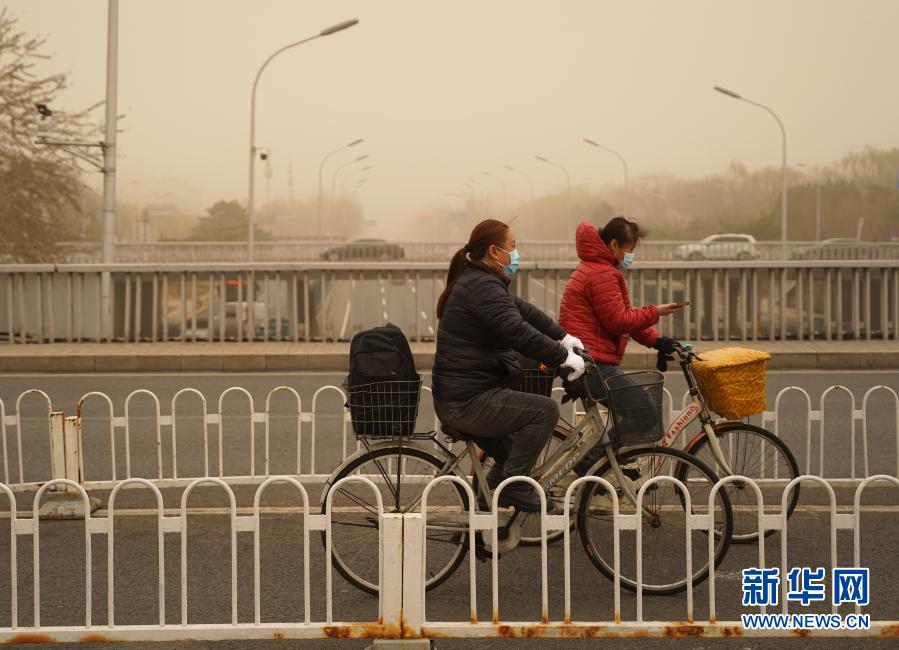 3月15日,市民骑车行驶在北京德胜门附近的道路上。当日,我国北方多地出现沙尘天气。新华社记者 贾浩成 摄