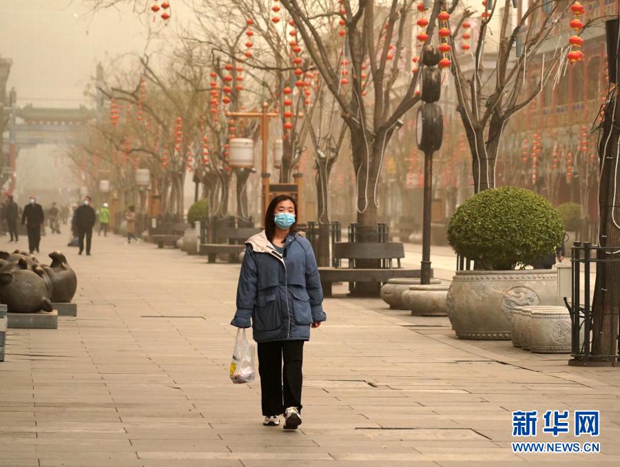 3月15日,行人走在北京前门商业街。当日,我国北方多地出现沙尘天气。新华社记者 张晨霖 摄
